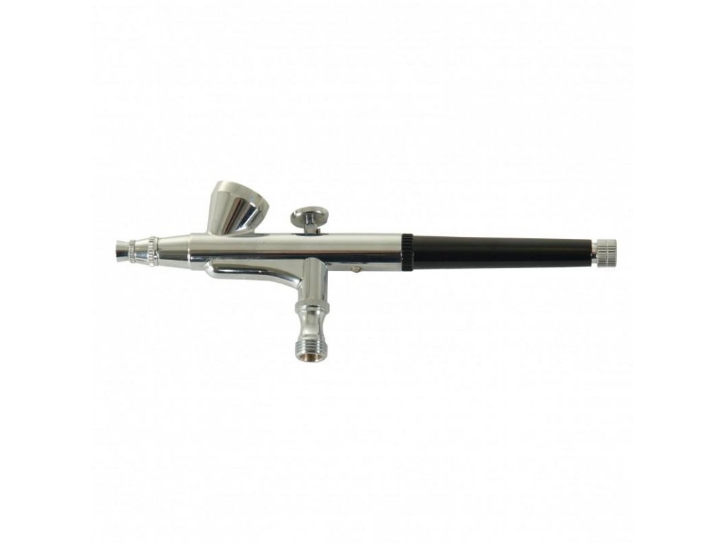 Airbrush striekacia pištoľ DED7477 s vrchným plnením farby je univerzálna celokovová dvojčinná striekacia pištoľ (v prvej fáze sa púšťa vzduch a v druhej fáze sa reguluje množstvo farby). Pochrómované telo pištole je v hornej časti vybavené napevno integrovaným spádovým kalíškom.