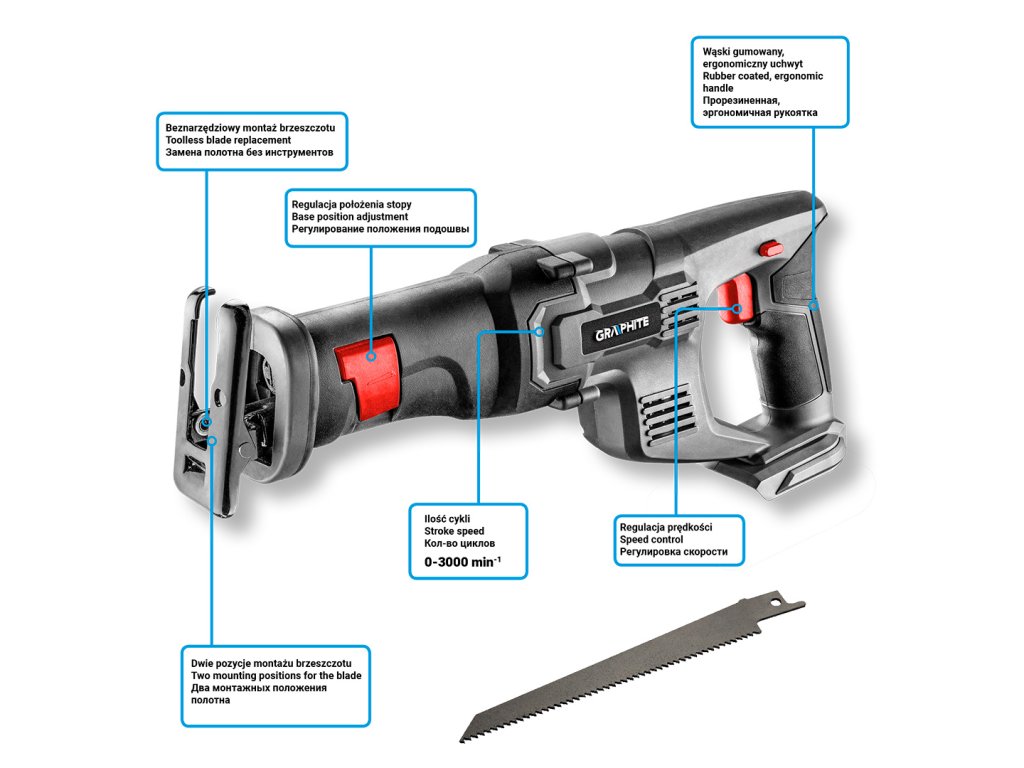 Chvostová píla GRAPHITE spolupracujúca s akumulátormi 18V Li-Ion GRAPHITE Energy+ (batéria nie je súčasťou balenie, treba zakúpiť samostatne), určená na rezanie dreva, kovov a plastov. Píla obsahuje dvojpolohové skľučovadlo na náradie prispôsobené na rýchlu výmenu čepelí bez použitia náradia.