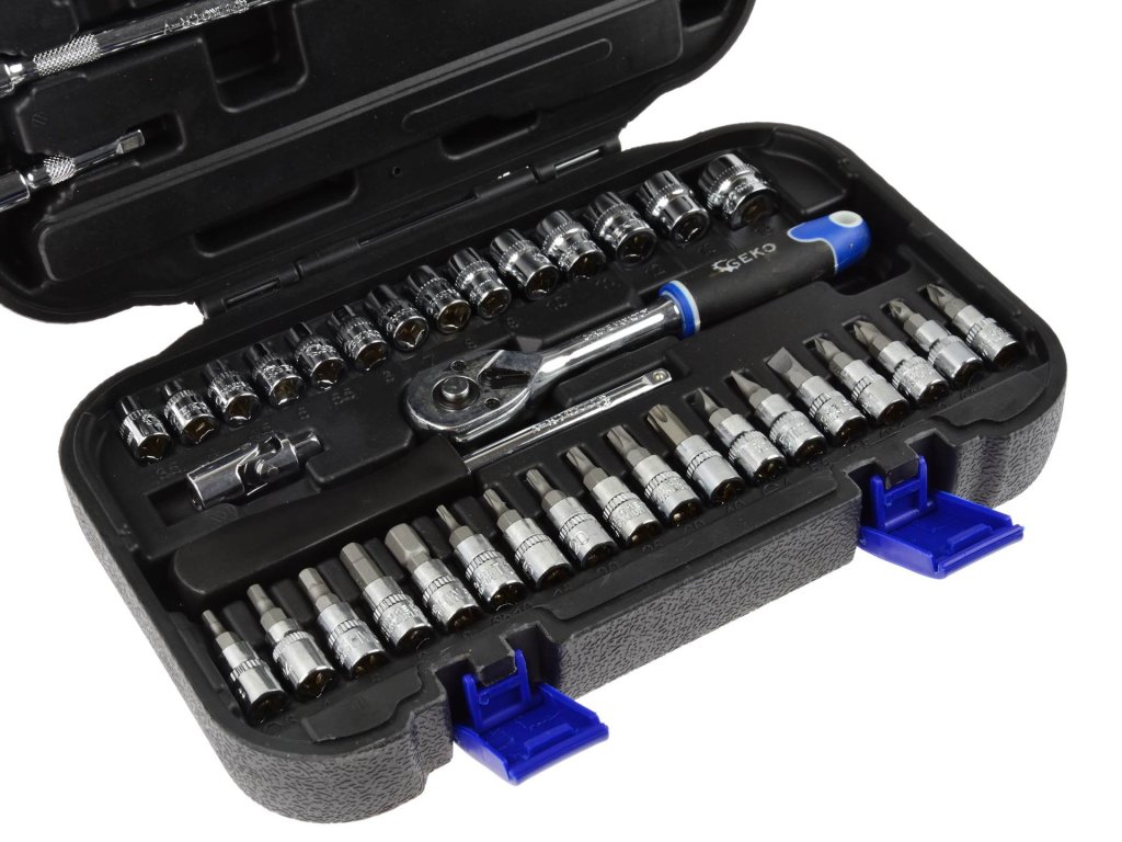 Súprava nástrčkových kľúčov z ocele Cr-V obsahuje dohromady 38 dielov a je uložená v kufri z odolného plastu. Súprava obsahuje račňu so štvorhranom veľkosti 1/4“, nástrčkové kľúče, bity a predĺženia.