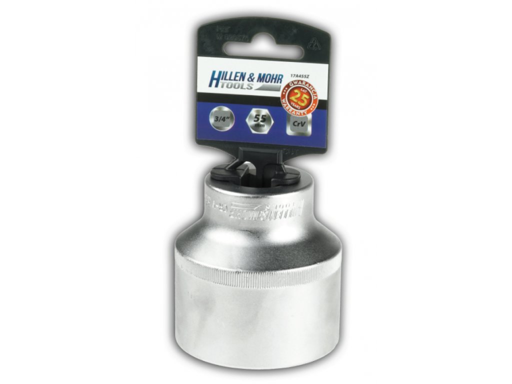 Nástrčný kľúč, šesťhranný nástrčný kľúč 3/4 "Hillen & Mohr 17A435Z 35 mm je vyrobený z chróm-vanádiovej ocele, čo zaručuje jeho vysokú pevnosť a tvrdosť. Zásuvka je prispôsobená na prácu s račňami, gombíkmi, kĺbmi a predĺženiami, s montážnou rukoväťou 3/4 ". Vnútorná časť objímky je šesťhranná, čo zaisťuje dobré dosadnutie objímky na odskrutkovaný alebo utiahnutý prvok.