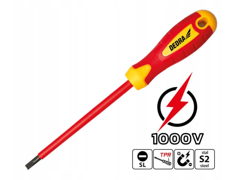 Izolovaný plochý skrutkovač je nástroj, ktorý sa bude používať pri prácach týkajúcich sa elektrických inštalácií. Skrutkovač chráni používateľa pred úrazom elektrickým prúdom až do 1 000 V.