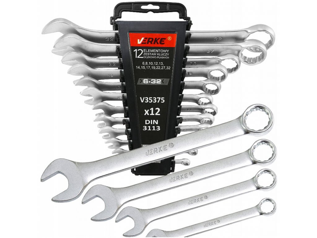 12-dielna sada očko-vidlicových kľúčov vyrobených z chróm-vanádiovej ocele. Kľúče sú uložené v praktickom plastovom balení.