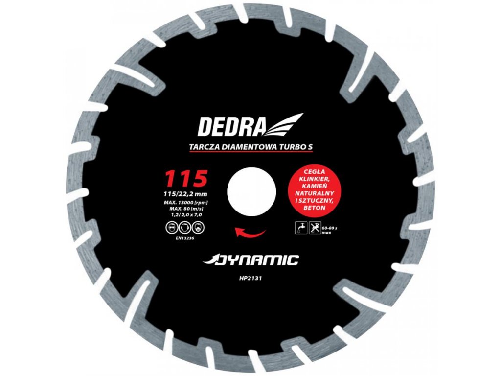 Diamantový segmentový kotúč Turbo Dynamic na rezanie betónu, tehly, lícovej tehly, keramických obkladov, dlažby a kameňa značky Dedra.