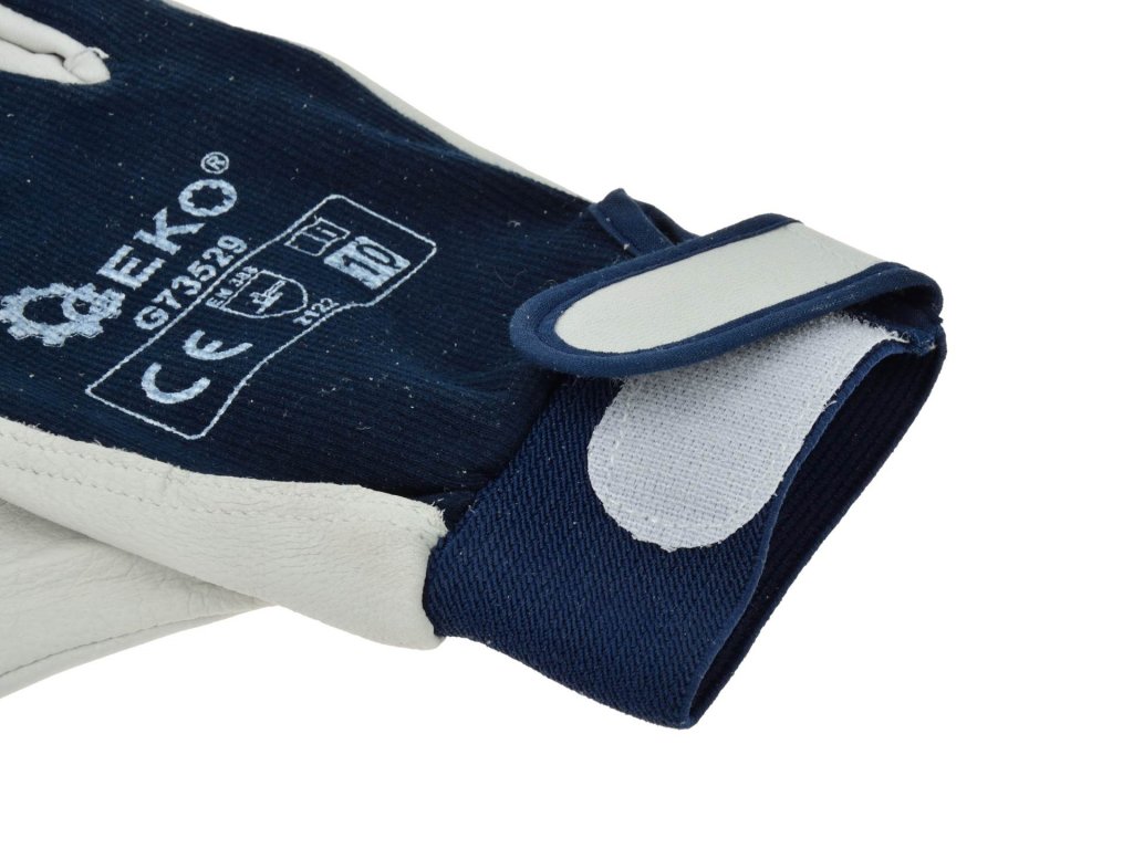 Kombinované kožené pracovné rukavice sú vyrobené z jemnej kože kozinky. Dlaňová časť je kožená, chrbát rukavice je vyrobený z kombinácie elastanu a bavlny. V zápästí je zapínanie na suchý zips.