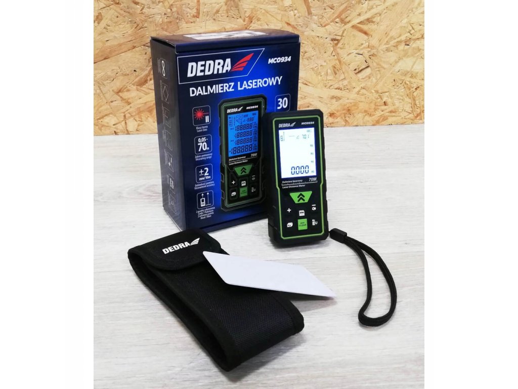 Rozsah merania laserovým diaľkomerom je od 5 mm do 70 m s výbornou presnosťou ± 2 mm / 10 m, čo poskytuje veľmi vysokú presnosť v porovnaní so štandardnými metódami merania a doba merania je neporovnateľne kratšia. V prípade silného slnečného žiarenia sa oplatí použiť reflexnú dosku pripevnenú k súprave, ktorá uľahčuje meranie v takýchto podmienkach a umožňuje tiež merania na zrkadle, skle, povrchoch s vysokou absorpciou svetla a ďalších, kde je priame meranie pomocou laserového lúča by bolo nemožné. Zariadenie je napájané dvoma malými batériami (2xAAA), ktoré stačia na vykonanie 8000 meraní.