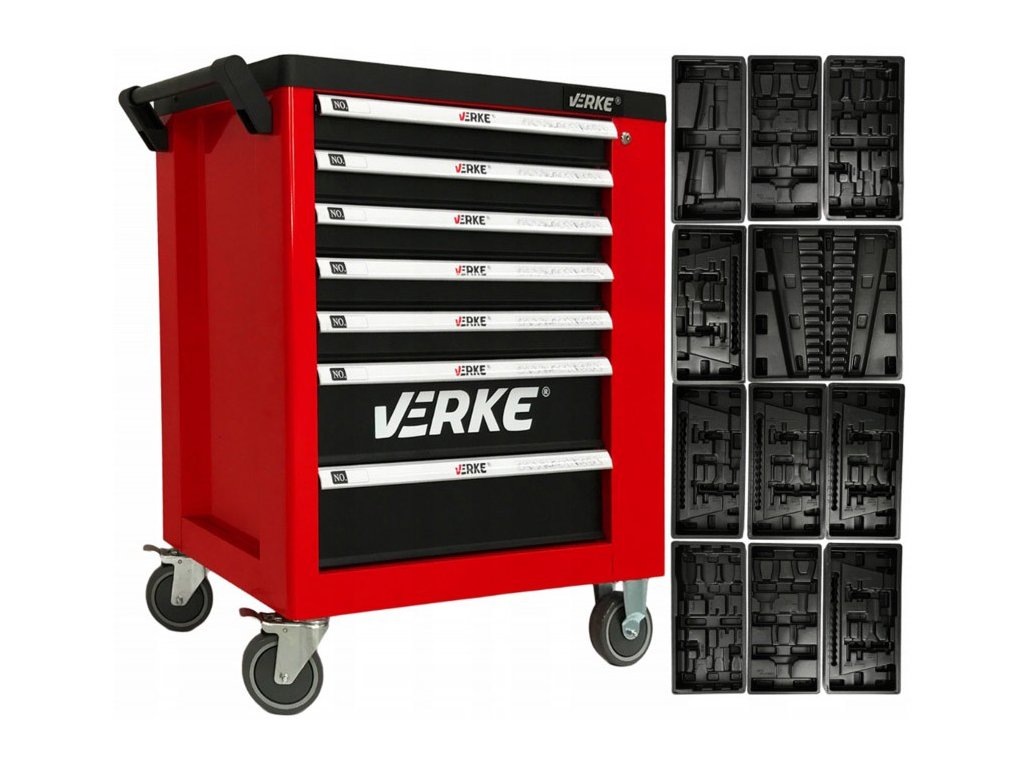 Montážny vozík obsahuje 7 zásuviek a z bočnej strany skrinku na odkladanie náradia. Vozík má 5 menších a 2 väčšie zásuvky. V hornej časti je organizér na odkladanie náhradných dielov. Zásuvky sú plne vysúvateľné na guľkových ložiskách, preto sa ľahko otvárajú. Centrálny zámok s dvomi kľúčmi zatvára všetky zásuvky. Jednoduchý pohyb zabezpečujú 4 kolieska a rukoväť. Vozík je vybavený 11 vložkami na náradie. Uplatnenie nájde v garáži, dielni či servise.