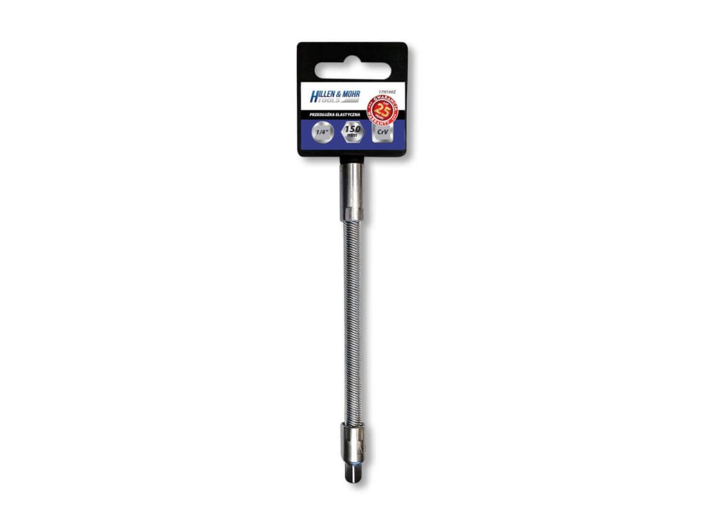 Pružné predĺženie z CrV ocele (chróm-vanád), ktoré zaisťuje dostatočnú pevnosť a odolnosť proti korózii. Rozšírenie umožňuje pracovať na ťažko dostupných miestach. 1/4 "montáž. Dĺžka 150 mm.