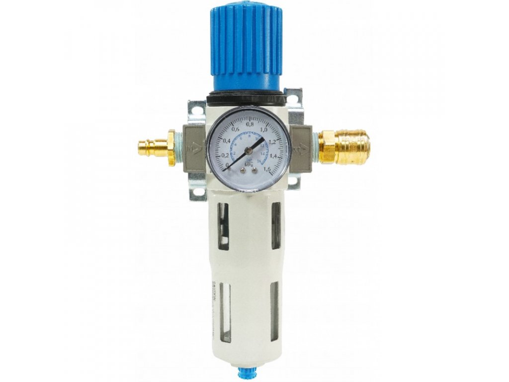Vzduchový odkalovač na kompresor na odlúčenie vody a nečistôt, ktoré obsahuje vzduch. Pomocou manometru a regulátoru je možné nastaviť potrebný výstupný tlak.