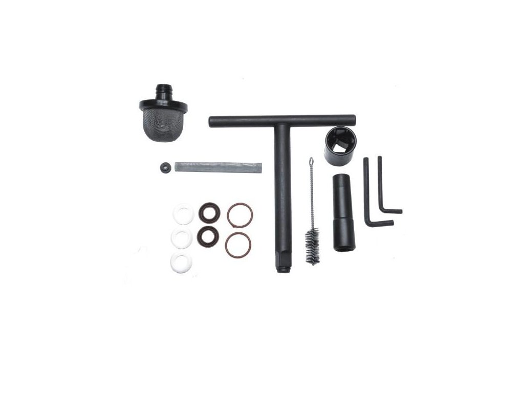 Opravárenská sada pre vysokotlaké striekacie zariadenie DED7421. Sada na opravu lakovacej jednotky - obsahuje všetky potrebné nástroje a diely na opravu a údržbu jednotky: filtre, tyč kefy, kľúče, piestové tesnenia, štvorhranný kľúč a nástrčný kľúč.