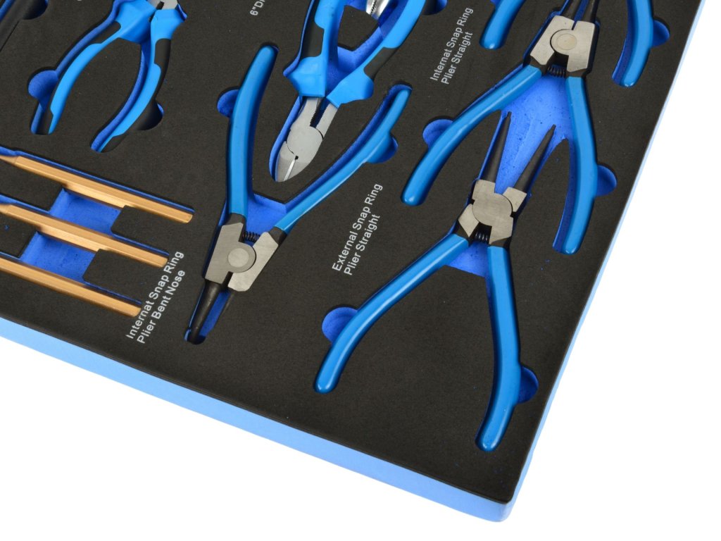 Penová vložka s náradím obsahuje ségerkové kliešte, nastaviteľné kliešte, kombinačky, kladivo a dierovače, vložka je vyrobená pre montážne vozíky. Pomocou presne tvarovanej pene si každý nástroj nájde svoje miesto a nehrozí jeho vypadnutie a poškodenie.