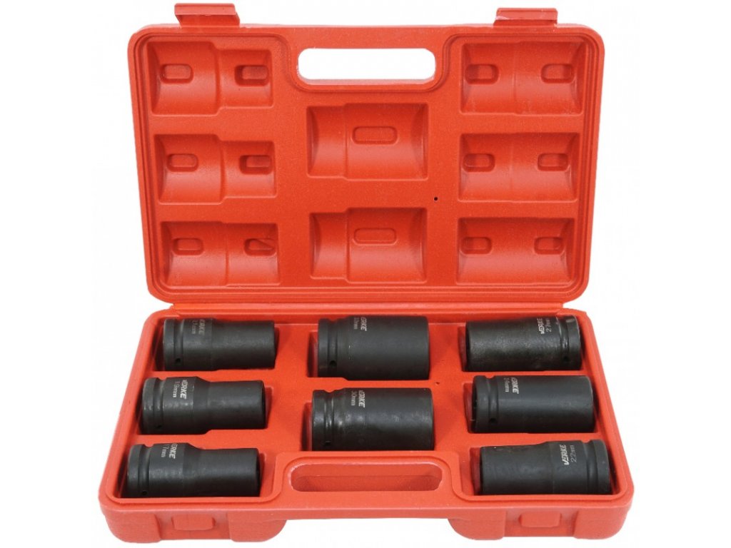 Sada 8 kusov kovaných šesťhranných nástrčkových kľúčov určených na štvorhran 3/4“ je vhodná na použitie s elektrickým, akumulátorovým alebo s pneumatickým náradím na uvoľňovanie silno utiahnutých skrutiek. Veľkosti kľúčov sa pohybujú od 17 mm do 32 mm. Nástrčkové kľúče sú vybavené zaisťovacím mechanizmom, pomocou ktorému bezpečne držia na štvorhrane nástroja. Kľúče sú uložené v plastovom kurfíku.