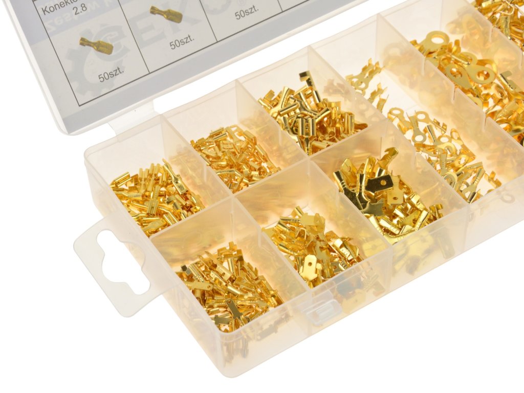 Sada obsahuje 450 kusov káblových automobilových konektorov zlatej farby, samce aj samice a skrutkové okrúhle (očkové) konektory. Súprava je uložená v plastovom boxe.