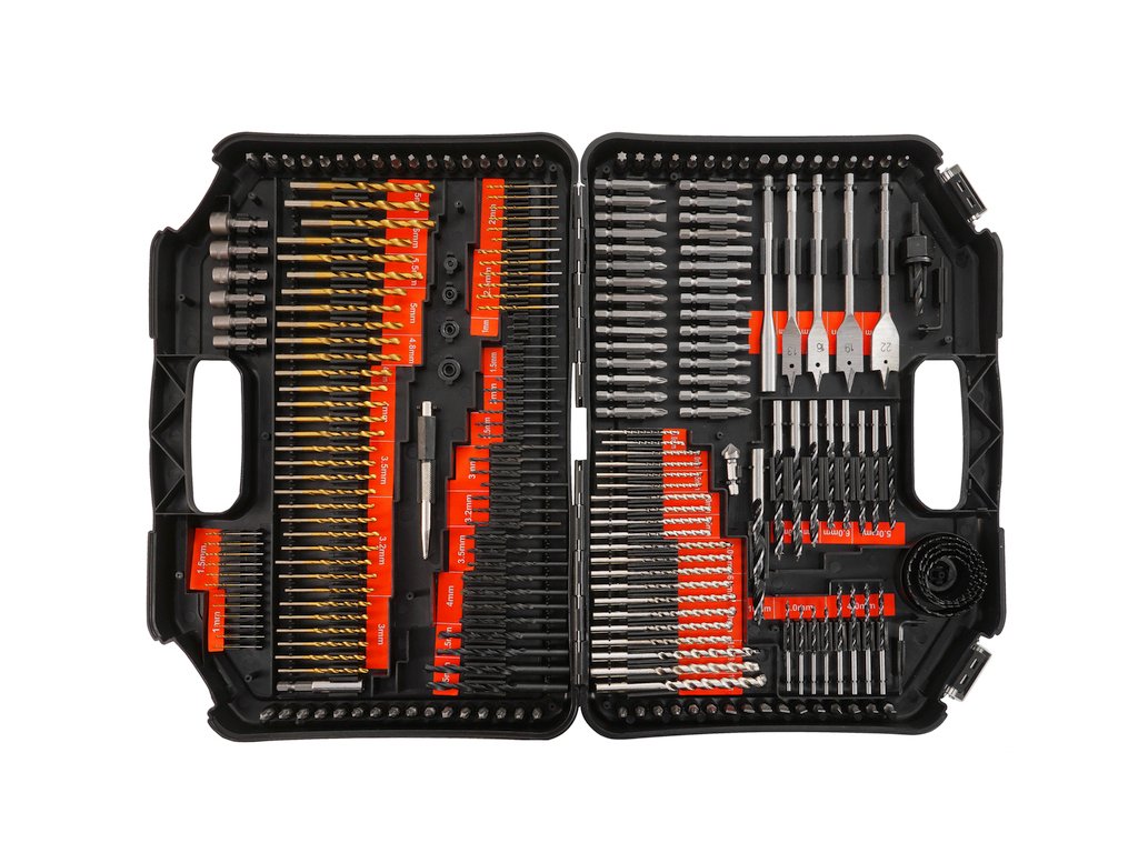 246-dielna sada vyrobená z ocele HSS obsahuje bity a vrtáky do dreva, kovu a betónu, nadstavce, adaptéry. Sada je umiestnená v praktickom kufríku pre pohodlné skladovanie a prepravu.