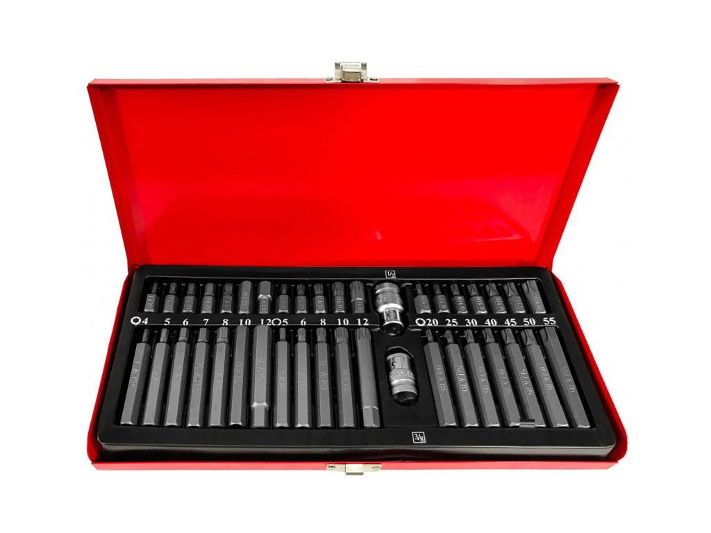 Sada 40 kusov nástrčných bitov TORX, imbus a XZN v kovovom kufríku. Rozmanitosť bitov poskytuje schopnosť vykonávať mnoho prác v špecializovaných mechanických a automobilových službách. Hroty majú dve dĺžky 30 a 75 mm, namontované v šesťhrannom držiaku 10 mm, prispôsobené na prácu s račňou 1/2 'a 3/8'. Sada je vyrobená z vysoko kvalitnej uhlíkovej ocele.