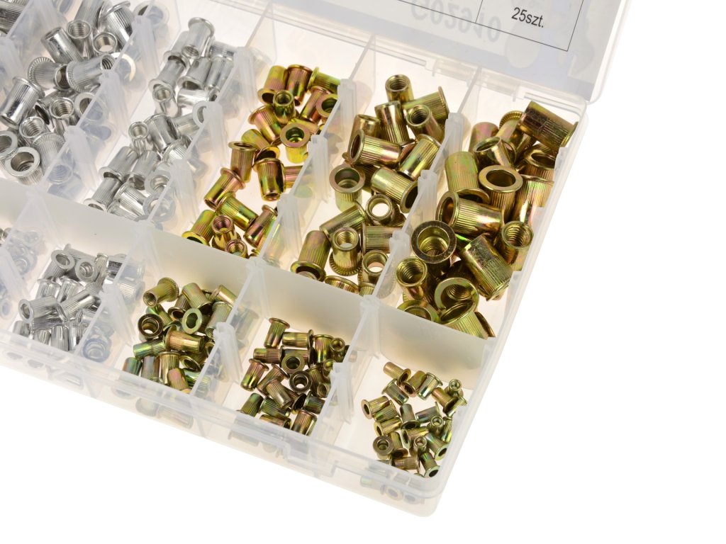 Nitovacie matice sú určené na uchytenie metrického závitu do tenkostenných materiálov, súprava obsahuje 150 ks nitovacích matíc z ocele a 150 kusov nitovacích matíc z hliníka v rozmeroch M3, M4, M5, M6, M8 a M10. Sú uložené v plastovom boxe.
