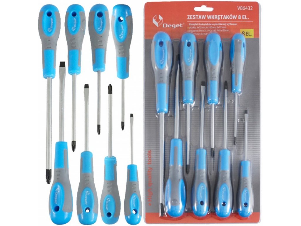 Krížové skrutkovače: PH1 x 75 mm, PH2 x 100 mm, PH3 x 150 mm, PZ1 x 75 mm, PZ2 x 100 mm