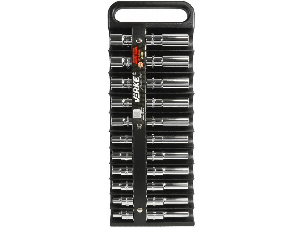 22-dielna sada nástrčných kľúčov s vnútorným šesťhranom. Kľúče sú vyrobené z chróm-vanádiovej ocele CR-V. Sada obsahuje krátke kľúče vo veľkosti 10, 11, 12, 13, 14, 15, 17, 19, 21, 22, 24 mm a predĺžené kľúče vo veľkosti 10, 11, 12, 13, 14, 15, 17, 19, 21, 22, 24 mm, ktoré sú určené na štvorhran 1/2". Nástrčné kľúče sú uložené v praktickom držiaku, ktorý sa dá zavesiť na stenu vo Vašej garáži, dielni či servise.