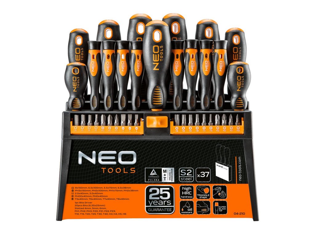 Súprava skrutkovačov a skrutkovacích nástavcov NEO (ref. č. 04-210) obsahuje 37 vysokokvalitných súčiastok. Hrot každého skrutkovača je zhotovený z mimoriadne odolnej ocele S2 zaručujúcej dlhú životnosť. Skrutkovače majú magnetickú koncovku. Trojhranný tvar držiaka s vyprofilovanou oporou pre palec znižuje zaťaženie rúk pri práci a uľahčuje dosiahnutie optimálneho momentu otáčania. Držiak z dvoch materiálov zabraňuje šmýkaniu v ruke, je odolný voči pôsobeniu chemikálií, olejov a mazív. Kvalita nástroja je potvrdená 25-ročnou zárukou výrobcu. Toto všetko, spolu s 8 precíznymi skrutkovačmi najvyššej kvality a 20 bitmi rôznych tvarov a veľkostí, umiestnenými v príručnom stojane uľahčujúcom uchovávanie. Značka NEO spĺňa očakávania profesionálov.Dodatočné parametre