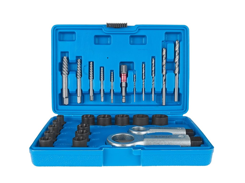 - Počet prvkov v súprave: 26 (zásuvky, vŕtačky, vyťahovače, adaptér, frézy na matice)