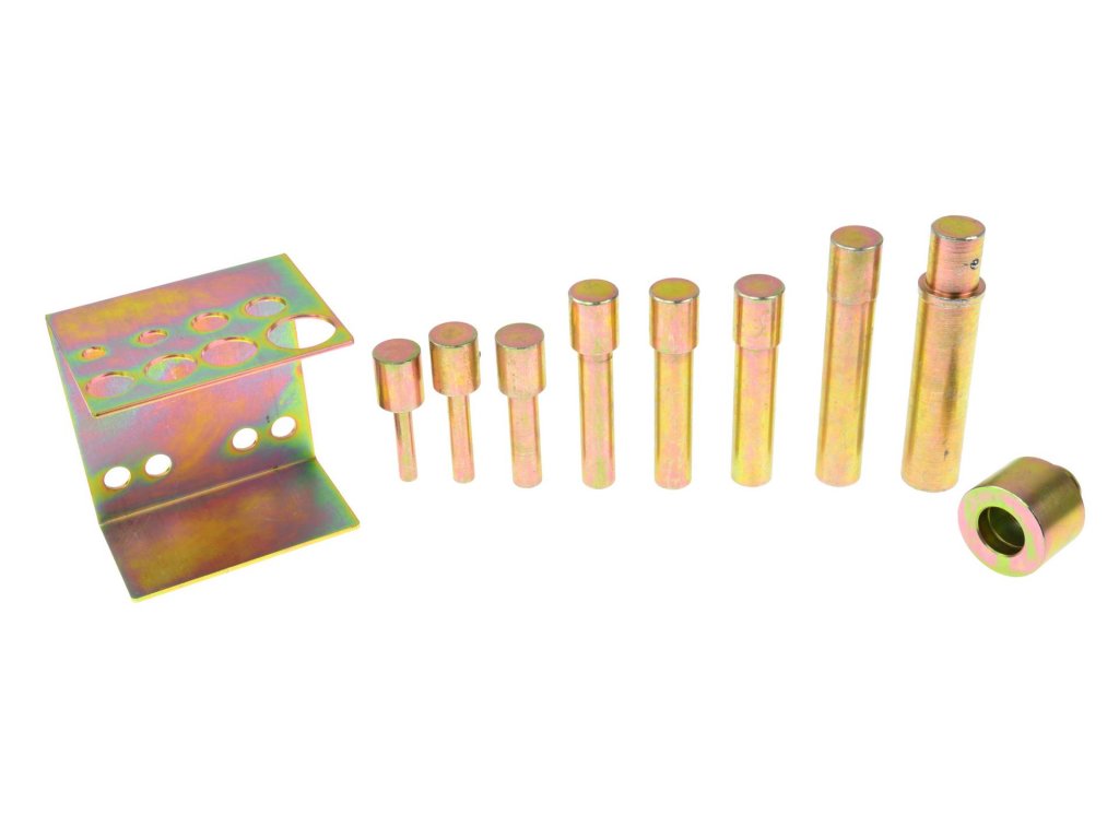 Sada vytláčacích tŕňov / adaptérov pre hydraulické lisy je vyrobená na vytláčanie ložísk a podložiek z rôznych iných komponentov. Sada obsahuje 8 nadstavcov rôznych veľkostí s rovnakým montážnym priemerom 25 mm. Nadstavce sú uložené v organizéri, ktorý je možné pripevniť priamo k nohe lisu.