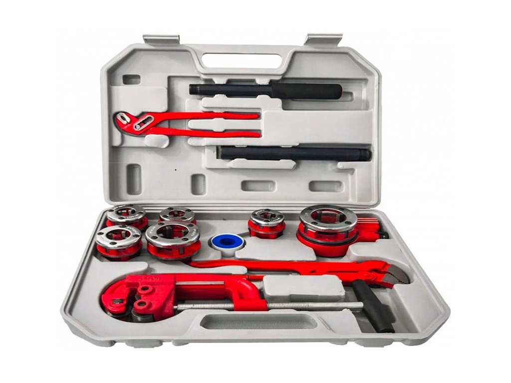 6-dielna sada závitníkov slúži pre rýchle a presné rezanie rúrkových závitov. Sada je využiteľná pri renováciách, stavbách alebo hydraulických prácach. Rezacie hlavy spolu s račňou, rezačkou rúrok a prestaviteľnými kliešťami sú uložené v praktickom plastovom kufri.