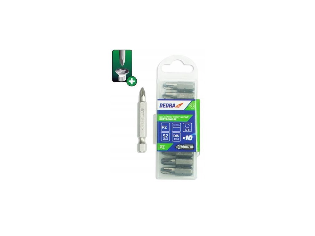 Skrutkovacie bity PZ2. Hroty sú vyrobené z ocele S2, ktorá sa vyznačuje vysokou kaliteľnosťou a odolnosťou proti nárazu. Vďaka vhodnému chemickému zloženiu a tepelnému spracovaniu si bity dlho zachovávajú svoje vysoké pevnostné vlastnosti.
