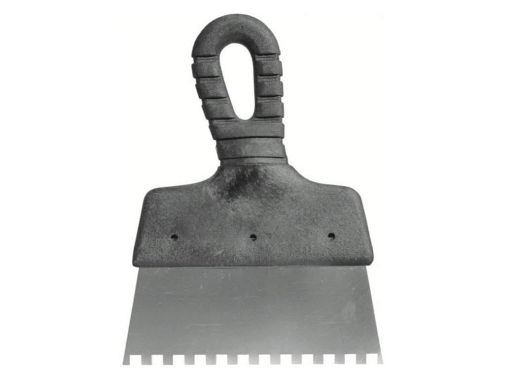 Špachtla 250mm z nehrdzavejúcej ocele so zubami určená na nanášanie a vyrovnávanie lepidla alebo malty. Najčastejšie sa používa pri pokládke dlaždíc. Zuby na špachtli umožňujú získať rovnomernú vrstvu lepidla. Rozmery zuba sú 6 x 6 mm. Rukoväť je vyrobená z plastu.