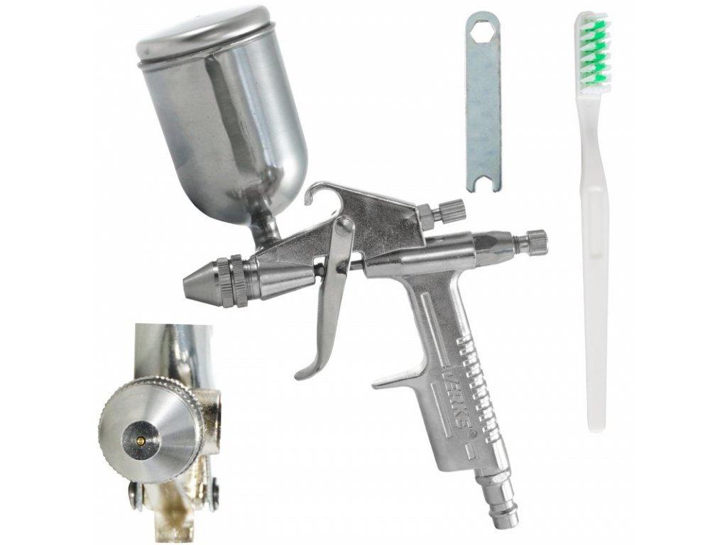 Striekacia pištoľ s nádobou 200 ml a tryskou 0,5 mm pre aplikáciu vodouriediteľných lakov, akrylových farieb a farieb s obsahom metalických a perleťových zložiek. Pištoľ umožňuje reguláciu nástreku farby v dvoch rovinách.