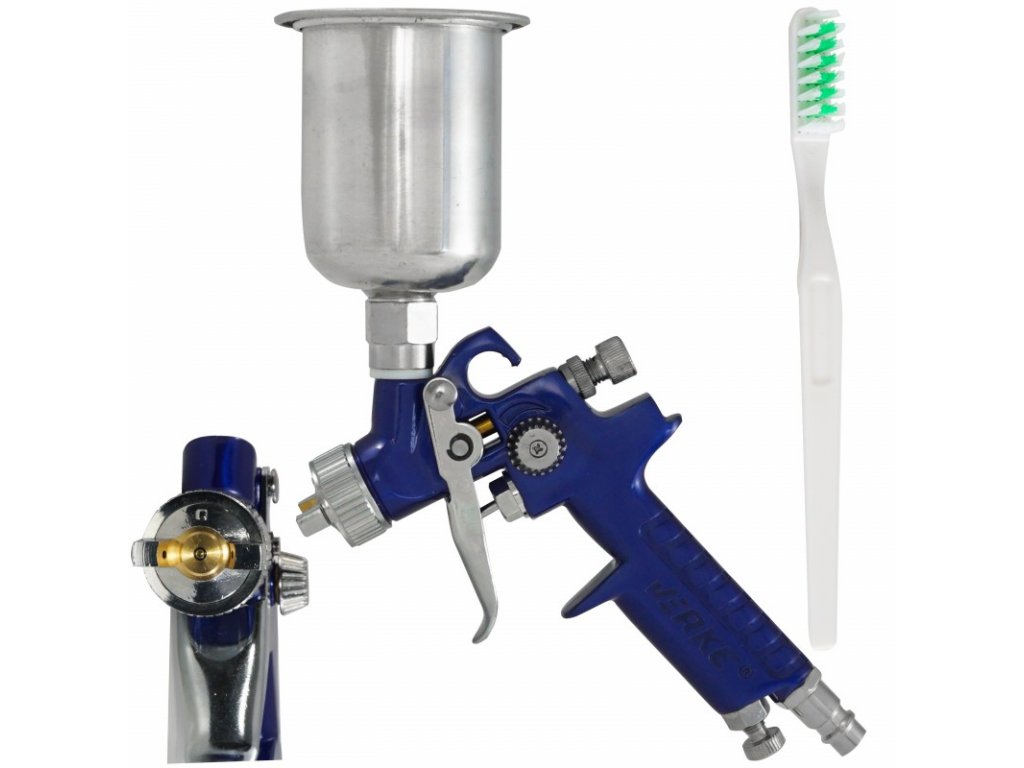 Striekacia pištoľ s objemom 125 ml a tryskou 1,0 mm je vyrobená na nanášanie vodou riediteľných lakov, akrylových farieb a farieb s obsahom metalických a perleťových zložiek. Technológia HVLP (High Volume Low Pressure) umožňuje použiť veľký objem farby aj pri nízkom tlaku, preto sa šetrí spotrebovaný vzduch. Pištoľ s ergonomickou a ľahkou rukoväťou umožňuje dlhú a pohodlnú prácu.
