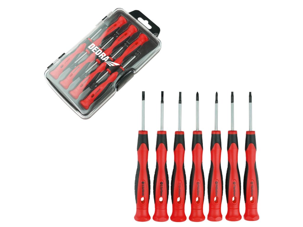 Sada 7 presných skrutkovačov, ktoré sa budú používať pri elektrických prácach, šperkoch alebo opravách domácich spotrebičov. Skrutkovače sú vyrobené z chróm-vanádiovej ocele, čo zaručuje ich tvrdosť a odolnosť. Pohodlná rukoväť vyrobená z gumy poskytuje užívateľovi pevné držanie počas práce. Skrutkovače majú navyše magnetické hroty, čo výrazne uľahčuje zaskrutkovanie a vyskrutkovanie.