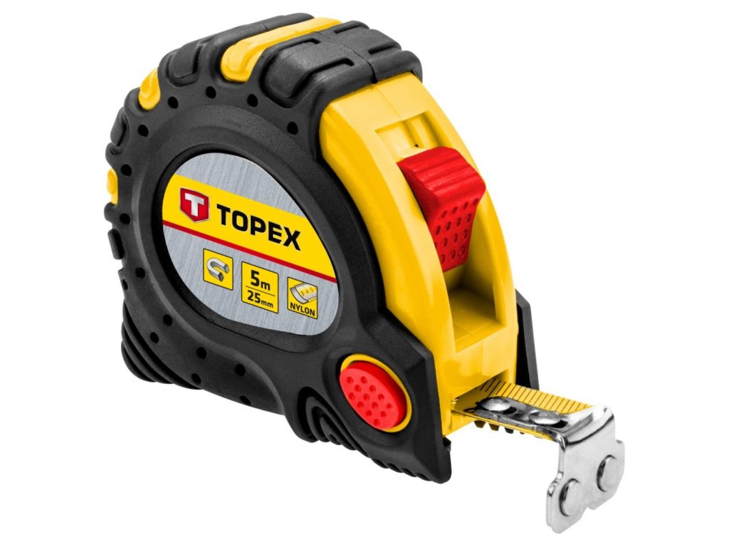 TOPEX Zvinovací meter, ocel 5 m x 25 mm s magnetom. Nylonový krytový pás chráni pred odieraním. Magnetická špička uľahčuje meranie. Ergonomický dizajn umožňuje bezpečné a pohodlné uchopenie. TOPEX je značka výborná pre domácich majstrov.Dodatočné parametre