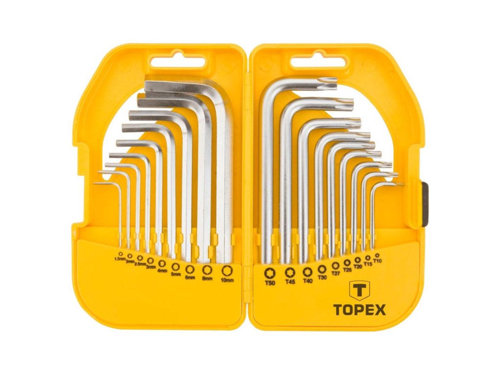TOPEX Sada imbus a torx, 18 ks / T10, T15, T20, T25, T27, T30, T40, T45, T50 / Sada je užitočná pri mechanických úlohách kutilov. Vyrobená je z odolnej chromo - vanádiovej ocele, ktorá zaručuje dlhú životnosť. Praktický plastový obal s miestom umožňuje jednoduché skladovanie. TOPEX je značka výborná pre domácich majstrov.Dodatočné parametre