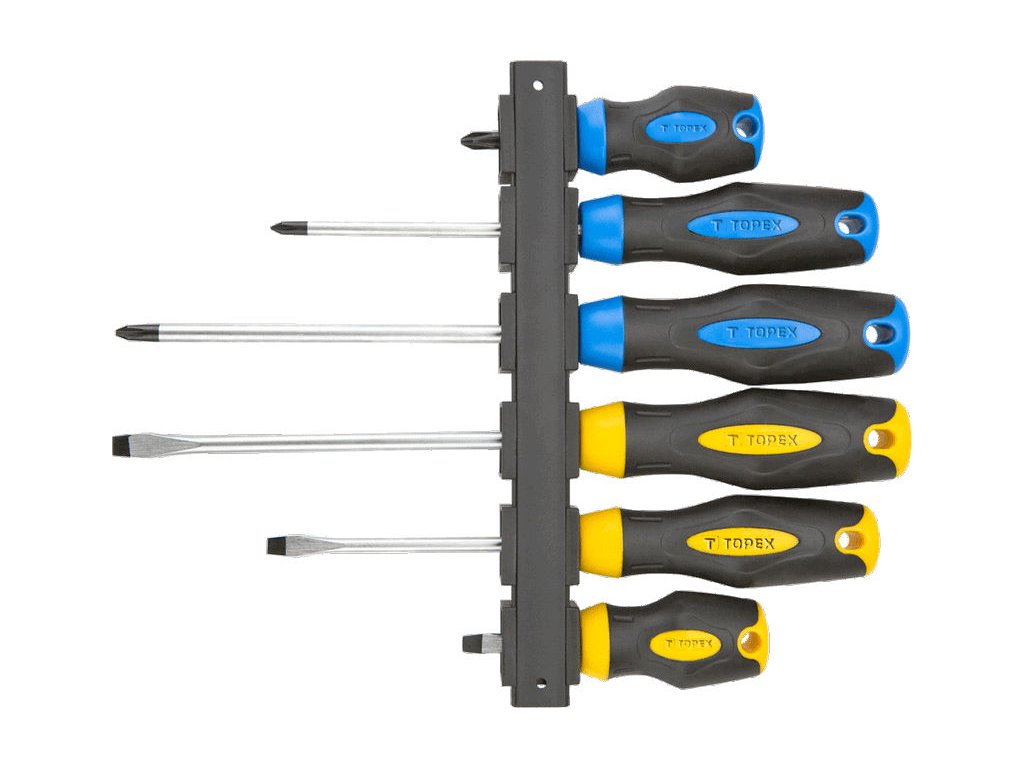 TOPEX Skrutkovače, sada 6ks / 5 x 38 mm, 5 x 100 mm, 6.5 x 150 mm, PH1 x 100 mm, PH2 x 38 mm, PH2 x 150 mm / Sada skrutkovačov je užitočným pomocníkom pri mechanických úlohach kutilov. Celá sada je vyrobená z odolnej chromo - vanádiovej ocele, ktorá zaručuje dlhú životnosť nástrojov. Veľkou výhodou je magnetická špička z tvrdenej ocele. Ergonomická plastová rukoväť je potiahnutá protišmykovým materiálom čím poskytuje komfort a bezpečnosť pri práci. TOPEX je značka výborná pre domácich majstrov.Dodatočné parametre